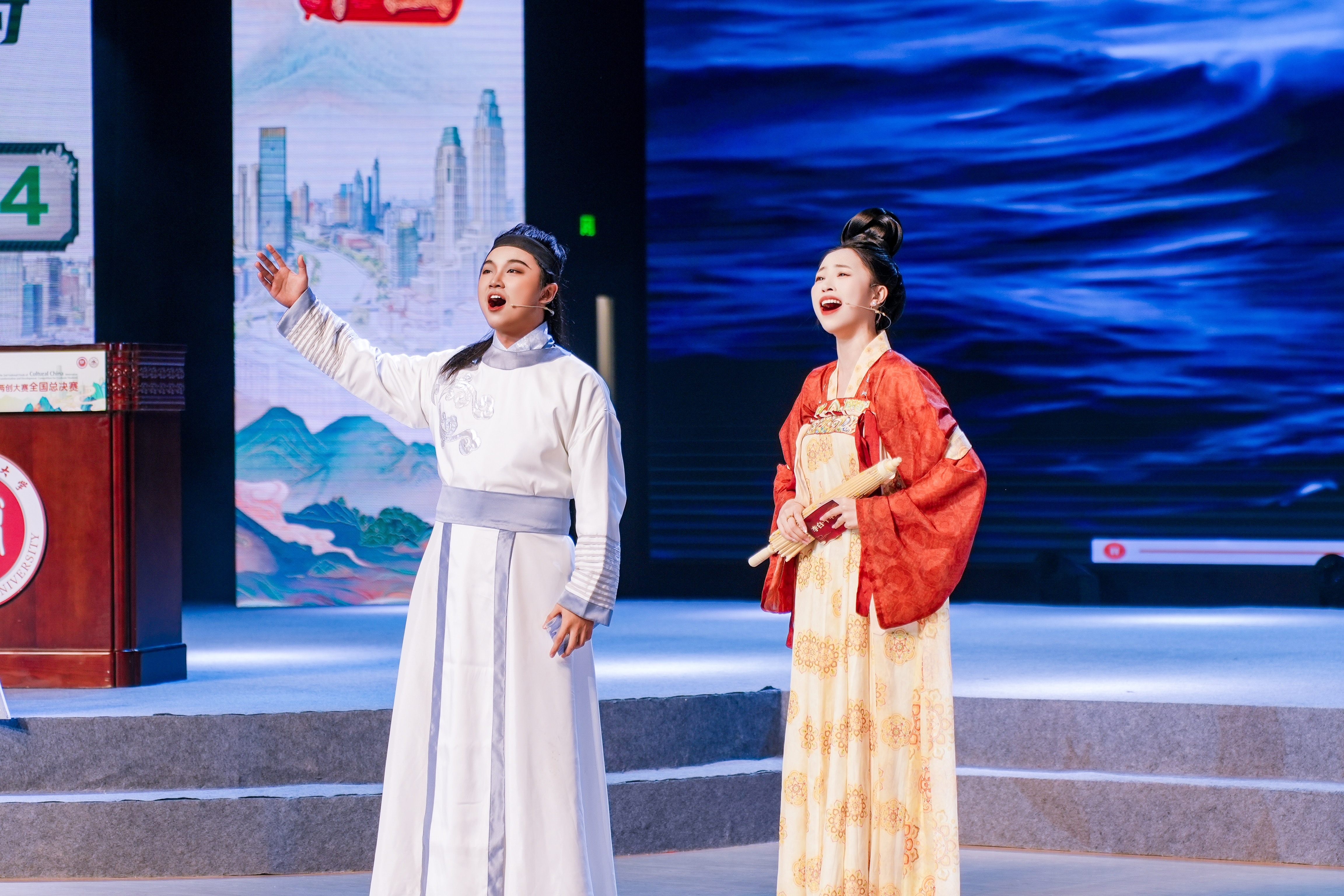 为让这份精神跨越时空传递,作品在艺术表达上大胆创新:12 分钟的篇幅暗藏 5 首精心创作的原创唱段,涵盖二重唱、三重唱、四重唱等丰富形式,流行摇滚的音乐风格打破传统历史题材的表达框架。舞台上的每一幕,都让李白 “长风破浪” 的云帆精神与当代大学生的现实困境深度映照,让文化血脉在青年群体中带着明确指引传承。 团队在比赛中还展示了一系列文创周边产品(包括吧唧、明信片、扇子、抱枕、挂画等),这些富有巧思的实物在现场展示环节,吸引了评委专家与观摩师生的浓厚兴趣,获得了积极反响。经过激烈角逐,原创音乐剧小品《李白・千年云帆》,以戏剧影视音乐组小组第一佳绩喜获全国总决赛一等奖。